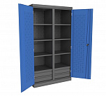 Шкаф инструментальный серии «PROFFI» предназначен для хранения оснастки, приспособлений и инструмента на рабочих местах в мастерских, цехах и других производственных зонах. Шкаф изготовлен из листовой стали и обеспечивает надежное запирание дверей ригельной системой. Шкаф содержит четыре ящика, одна перегородка и восемь полок. Размеры:(ВхШхГ) 1800x1000x500 мм. Масса: 71,4 кг. Нагрузка на полку – не более 100 кг. Нагрузка на перекладину - не более 15 кг. Суммарная нагрузка на шкаф не более 400 кг.