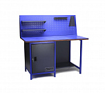 Однотумбовый. Допустимая нагрузка на столешницу 750 кг. Опорные элементы выполнены сварными из холоднокатаной стали. Верстак состоит из столешницы, опоры, тумбы P5 с четырьмя малыми и одним большим ящиком, полки-стенки, двойного экрана с кронштейнами и комплекта освещения. Столешница состоит из фанеры марки ФСФ толщиной 24 мм, которая покрыта лаком-антисептиком и листом оцинкованной холоднокатаной стали толщиной 1,2 мм. Размеры (ВхШхГ) 1965x1396x696 мм.