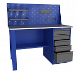 Однотумбовый. Допустимая нагрузка на столешницу 750 кг. Опорные элементы выполнены сварными из холоднокатаной стали. Верстак состоит из столешницы, опоры, тумбы P5 с четырьмя малыми и одним большим ящиком, полки-стенки и одинарного экрана с кронштейнами. Все металлические элементы покрыты полиэфирной порошковой краской. Столешница состоит из фанеры марки ФСФ толщиной 24 мм, которая покрыта лаком-антисептиком и листом оцинкованной холоднокатаной стали толщиной 1,2 мм. Размеры (ВхШхГ) 1470x1396x696 мм.