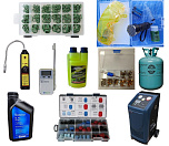 Комплект для заправки автомобильных кондиционеров состоит: автоматическая установка для заправки кондиционера, фреон, масло, течеискатель хладагента, набор золотников, ультрафиолетовая добавка, набор резиновых колец, набор колпачков и цифровой термометр