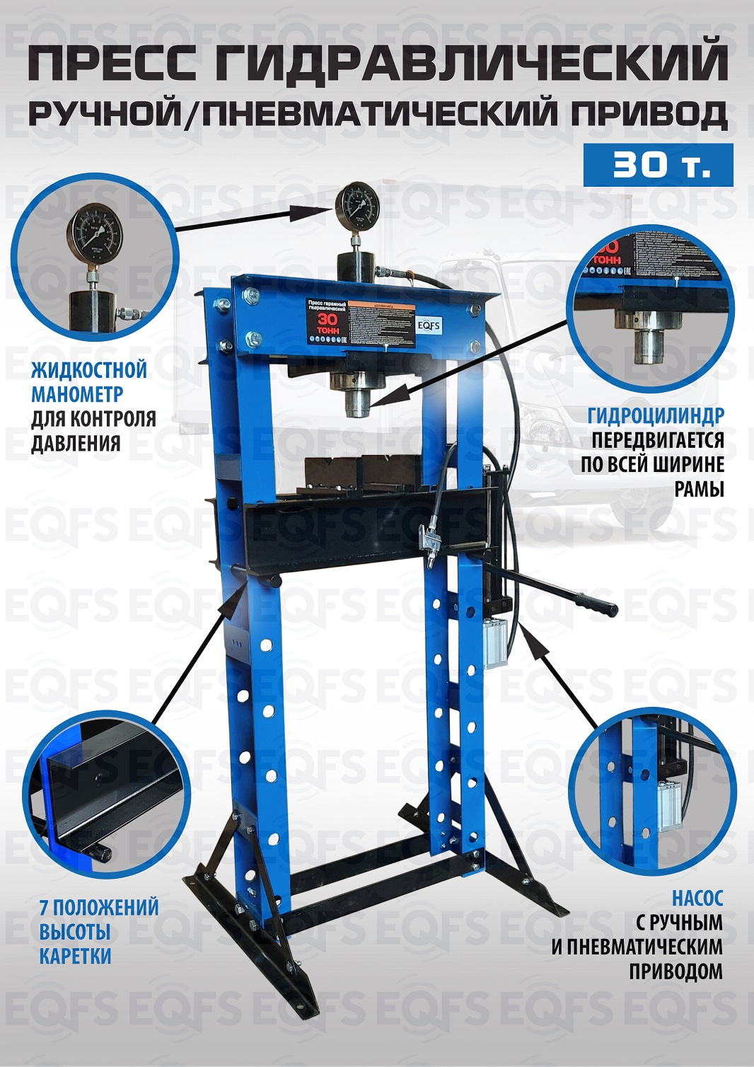 Пресс гидравлический 30 тонн. Управление ручное/пневматическое, манометр, гидроцилиндр с пуансоном перемещается по всей ширине каретки. Рекомендуется для выпрессовки подшипников, деталей машин, втулок и т.п. в автосервисе, Гараже и СТО. Подъёмная площадка регулируется по высоте и фиксируется в требуемом положении. Ход поршня 0-160 мм. Рабочее окно 530х980 мм. Давление воздуха 0,85 Мпа. Доставка по РФ и ТС.