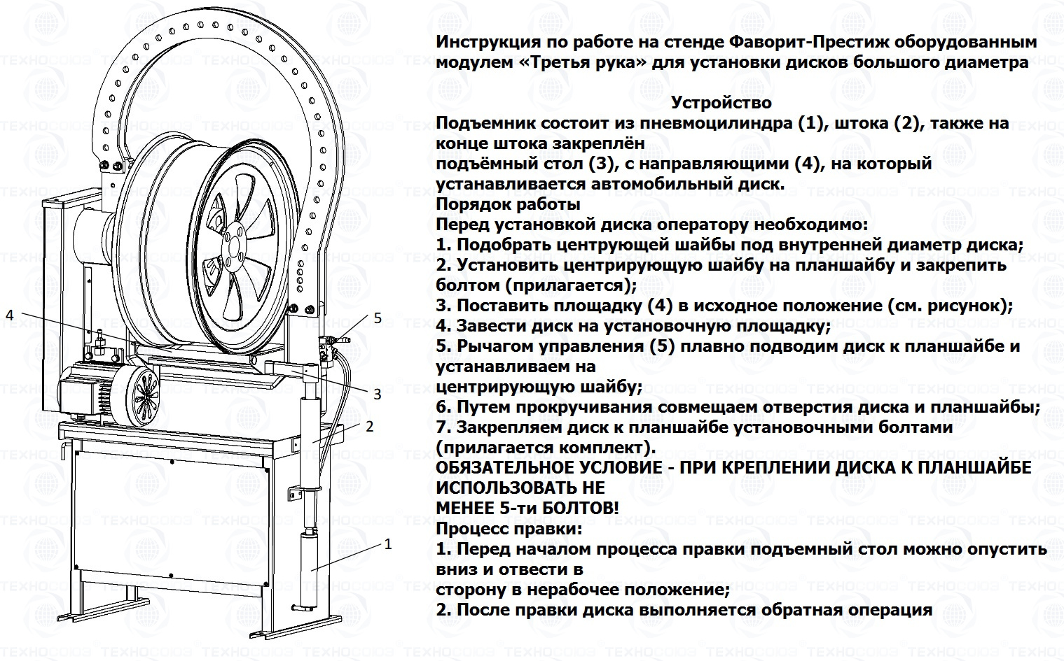 Подъемник состоит из пневмо-цилиндра (1), штока (2), также на конце штока закреплён подъёмный стол (3), с направляющими (4), на который устанавливается автомобильный диск, рычаг управления(5), центрирующая шайба(6), планшайба(7), отверстия для установки крепежных болтов(8).