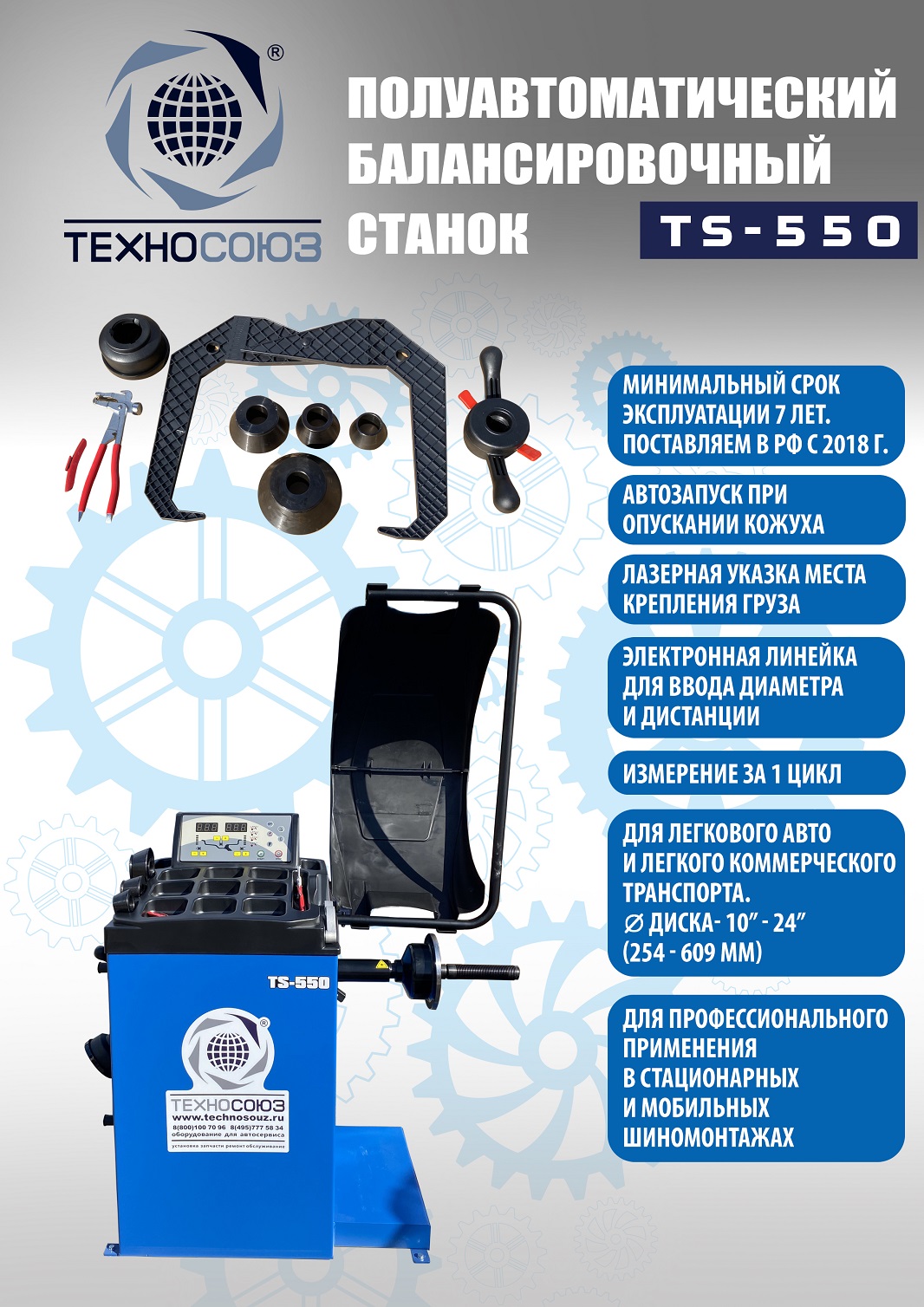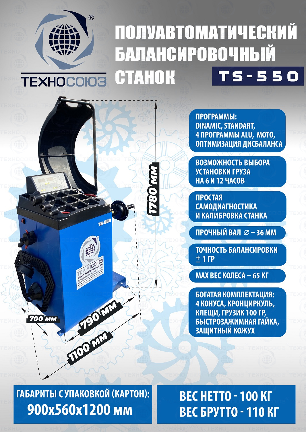 TS-550 Балансировочный станок (с лазером) Автоматический ввод дистанции и диаметра диска. Полуавтомат. Автозапуск опусканием кожуха. Станок для колес легковых автомобилей, мотоциклов, «Газелей», «Спринтеров» и т.п. с диаметром диска с резиной до 800 мм. Размеры диска: ширина 3–10” (76-254 мм) , диаметр диска 10–24” (254÷609 мм). Вес ≤ 65 кг. Вал- 36 мм.Точность ±1гр. 220 В. Режимы работы DINAMIC, STATIC, ALU1, ALU2, ALU3, ALUS, ST. Автокалибровка. Гарантия 12 мес. В комплекте: кожух с автозапуском + клещи + кронциркуль + быстрозажимная гайка + набор конусов.