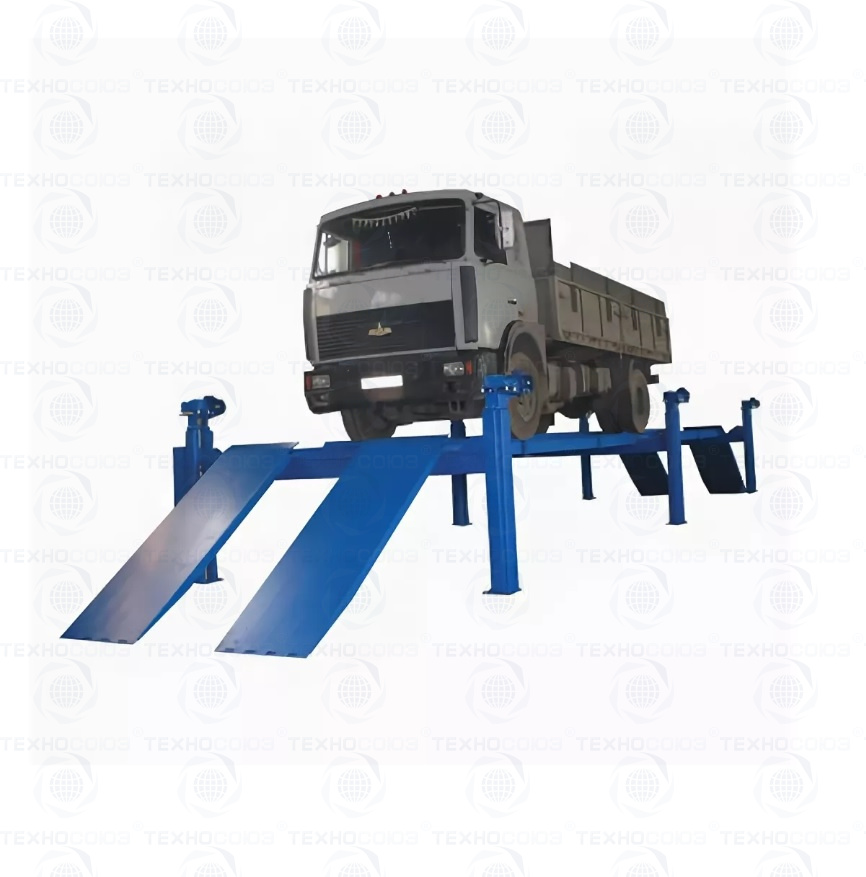 Подъемник состоит из шести стоек 1, 2, 3, 4, 5, 6 (см. Рис.), каждая из которых имеет электромеханический привод, состоящий из электродвигателя и червячного редуктора, грузовой винт, рабочую и страхующую гайки, конечные выключатели верхнего и нижнего положений балок. Стойки попарно соединены поперечными балками лежащими на опорных шайбах рабочих гаек. На поперечных балках установлены платформы фиксируемые в зависимости от колеи автомобиля. На стойке 1 установлен шкаф аппаратный, с панелью электрооборудования, лампочками «Сеть» и «Аварийное отключение», кнопками управления «Вверх» и «Вниз» и с автоматическим выключателем. Стойки подъемника крепятся на раме, состоящей из трех оснований. Рама в зависимости от пожелания заказчика может быть забетонирована в пол, либо установлена на поверхности пола с возвышением над уровнем пола на 74 мм.