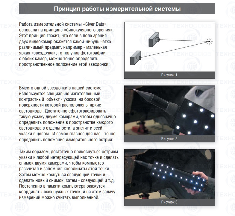 Система обеспечивает бесконтактное измерение координат мишени-указки в пространстве, путём фиксирования её положения видеокамерами и дальнейшим трёхмерным моделированием. Система использует принцип бинокулярного зрения: так же работает человеческий глаз, когда нам необходимо визуально определить расстояние до какого-либо объекта. Функцию «глаз» в системе выполняют две камеры, расположенные на концах измерительной балки. Если какой-либо контрастный объект попадает в поле зрения двух камер, система может точно вычислить его пространственные координаты. Таким контрастным объектом служат расположенные в особом порядке светодиодные лампочки на мишени-указке. Достаточно в поле зрения двух камер прикоснуться щупом к любой интересующей нас точке на кузове автомобиля, чтобы определить её положение в трехмерном пространстве.