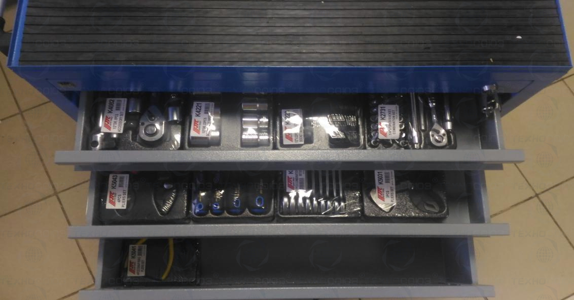 Данный набор инструмента включает: тележку инструментальную с 4 ящиками, комбинированные ключи, наборы головок и отверток, клещи, утконосы, щипцы и трещотку - это тот самый минимум, который понадобится при работе в гараже или СТО.