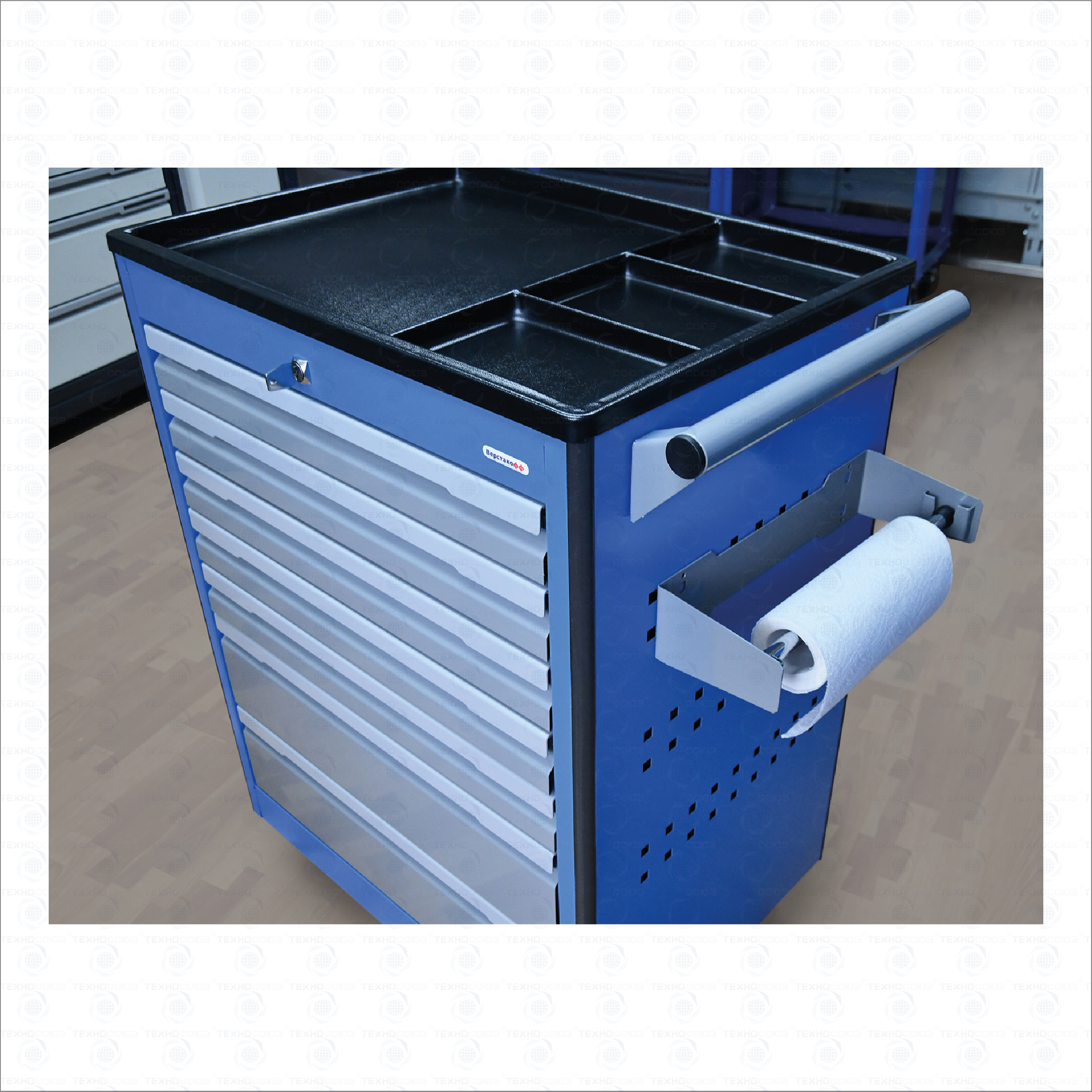 5 ящиков. Нагрузка на тележку 220кг. Корпус тележки сварной. Тележка оснащена системой антиопрокидывания новой конструкции, которая блокирует открывание ящиков. На боковых стенках корпуса выполнена квадратная перфорация для установки крючков, держателей и других аксессуаров. Ящики на шариковых телескопических направляющих полного выдвижения. Обеспечен свободный и плавный ход ящиков даже при полной загрузке. Габаритные размеры тележки с учетом колес, лотка и ручки (ВхШхГ), не более: 958х780х490 мм. Вес: 49 кг.