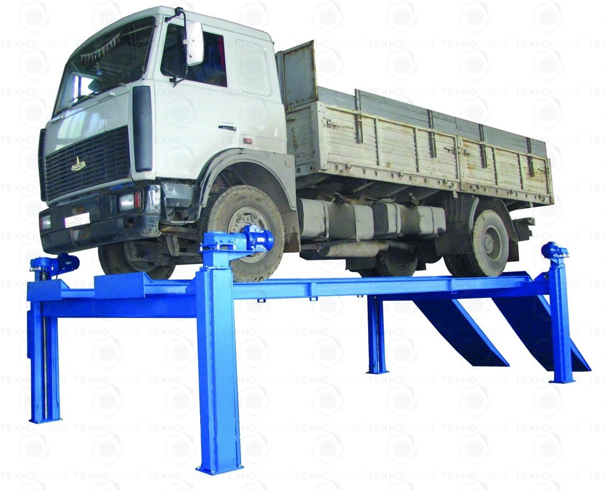 г/п. 15 тонн. Четырехстоечный. Электромеханический. Для ремонта грузовых автомобилей отечественного и импортного производства и автобусов на любой ровной площадке. и автобусов на любой ровной площадке. Привод червячный редуктор, с концевыми выключателями нажимного действия, ограничивающими ход каретки. Рабочие гайки повышенной прочности и износостойкости. Многоуровневая система безопасности. По отдельному заказу комплектуется установочными рамами. Поставляется в 2 вариантах Стандарт (в помещение) и ТЗ (Для эксплуатации на улице).